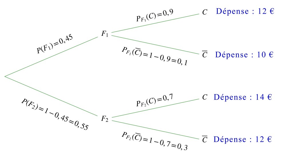 - On considère la variable aléatoire $X$ qui donne la dépense, en €, du client. Etablir la loi de probabilité de $X$.