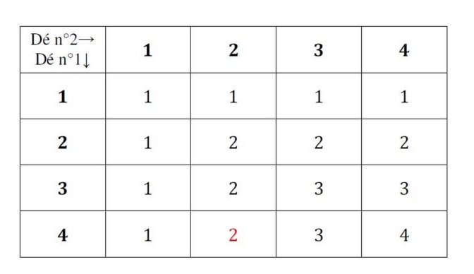 Par exemple, si on obtient 4 avec le dé n°1 et 3 avec le dé n°2 alors $X$ prend la valeur 3.