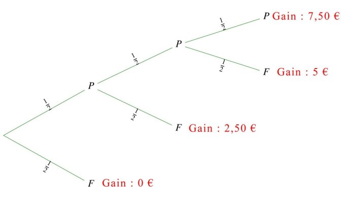 Un jeu consiste à lancer une pièce de monnaie bien équilibrée de 1 à 3 fois de suite. Plus précisément, on lance successivement la pièce en respectant ces règles :