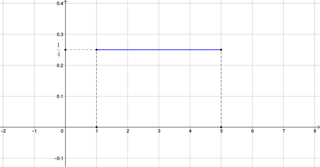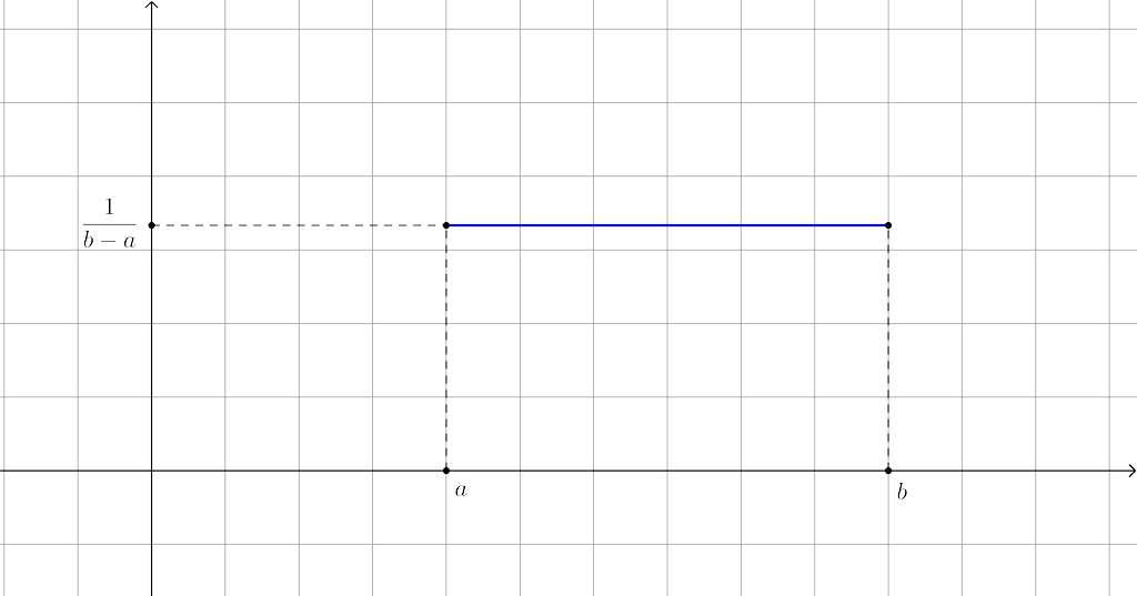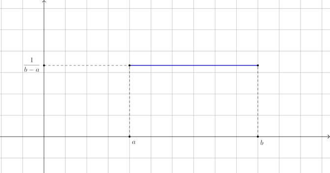 Remarque : pour retrouver la valeur de la constante $\frac{1}{b-a}$, on peut se rappeler que l’aire sous la courbe (qui est en fait un rectangle) doit valoir 1. Comme la longueur mesure $b-a$, alors la largeur vaut $\frac{1}{b-a}$.