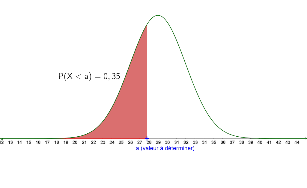 C’est le cas, par exemple, d’un énoncé comme celui-ci : « On sait que $X$ suit la loi normale d’espérance $\mu =29$ et $\sigma=3$. Déterminer le nombre $a$ tel que $P(X\lt a)=0,35$. ». Cet énoncé se traduit graphiquement par la détermination d’une abscisse (un seuil) pour laquelle l’aire comprise entre la courbe et l’axe des abscisses à gauche de $a$ vaut $0,35$ :
