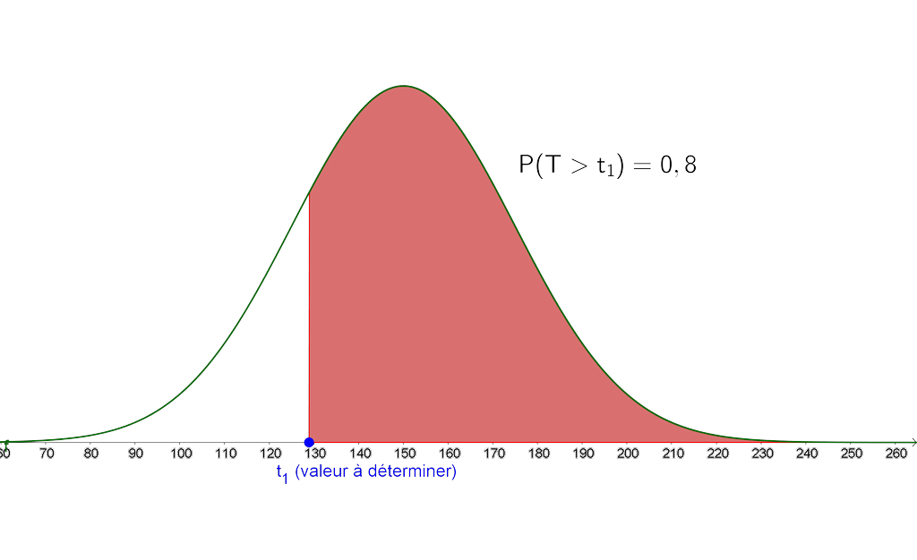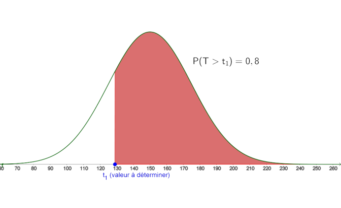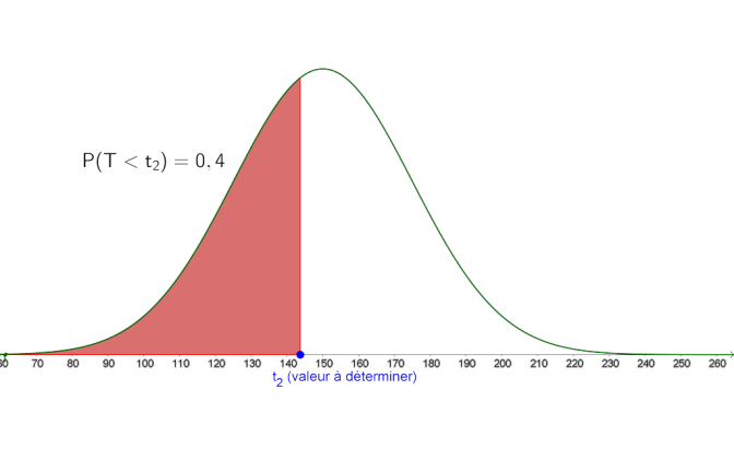Déterminer, avec la calculatrice, des valeurs arrondies au centième de $t_1$ et $t_2$ telles que $P(T\gt t_1)=0,8$ et $P(T\lt t_2)=0,4$.