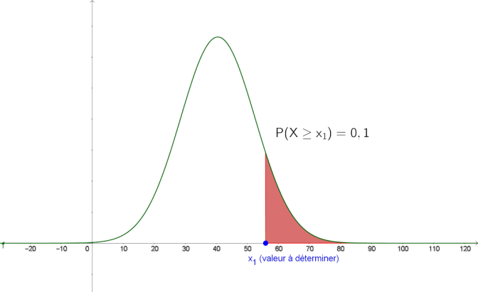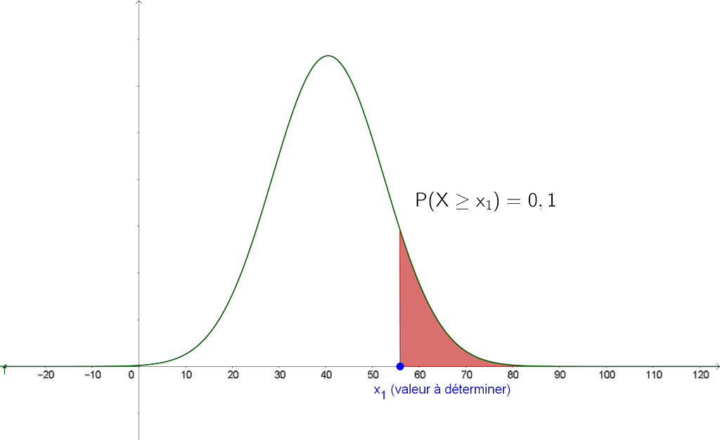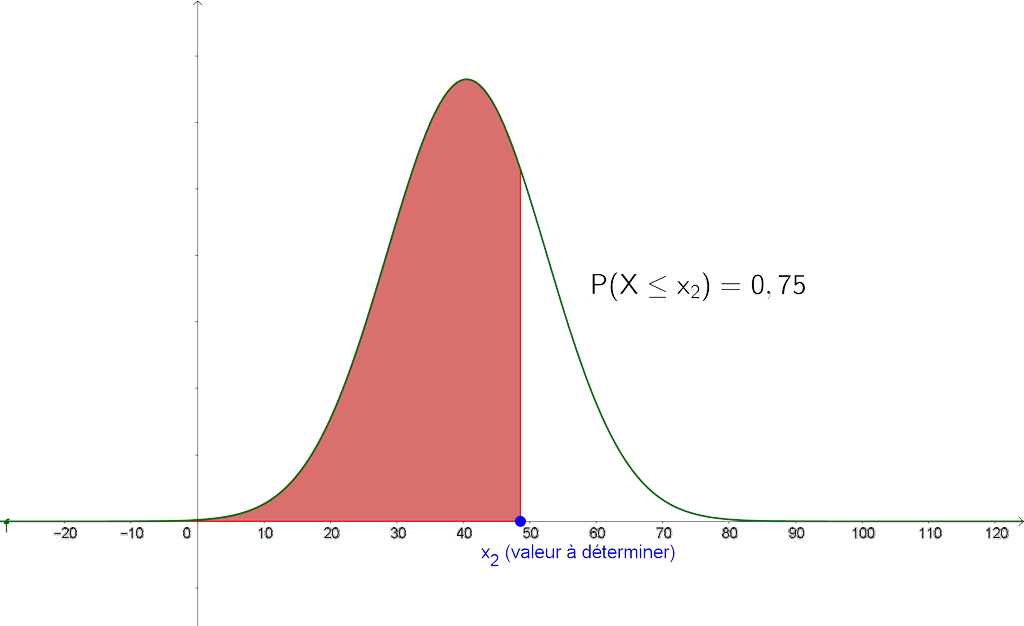 Déterminer, avec la calculatrice, des valeurs arrondies au dixième de $x_1$ et $x_2$ telles que $P(X\geq x_1)=0,1$ et $P(X\leq x_2)=0,75$.
