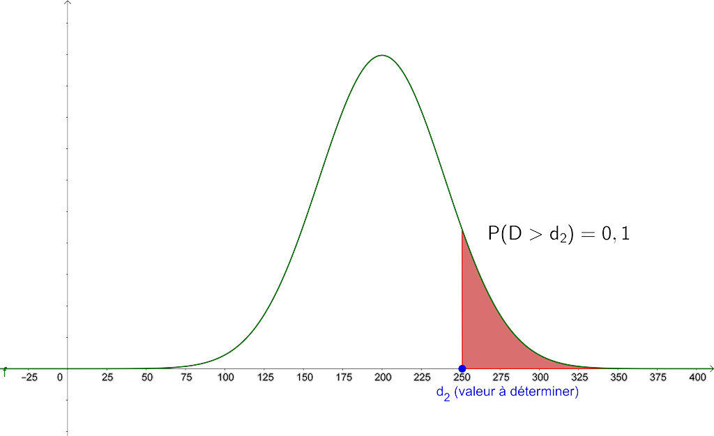 Une entreprise lance la production de batteries pour véhicules électriques. Des études ont permis d’établir que l’autonomie $D$ d’un véhicule équipé d’une batterie suit la loi normale d’espérance $\mu=200$ km et $\sigma=40$ km. Lorsque l’autonomie d’une batterie est atteinte, le véhicule s’arrête et il faut recharger la batterie.