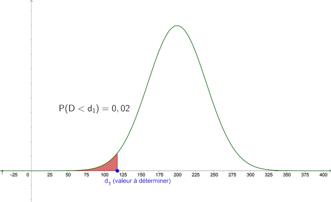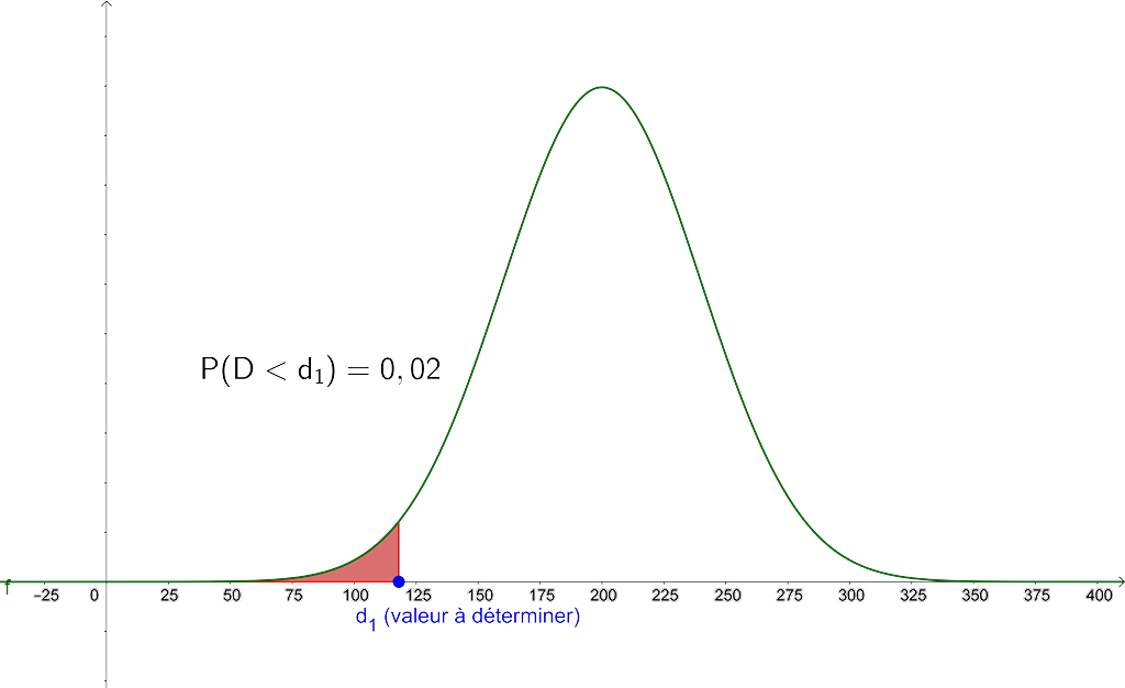 - L’entreprise décide de remplacer gratuitement 2 % des batteries vendues (celles dont l’autonomie est la plus faible). En dessous de quelle autonomie $d_1$, une batterie est-elle remplacée gratuitement ?