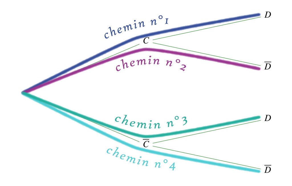 Par conséquent, en reprenant les notations de l’illustration précédente, si on demande de calculer la probabilité de $C\cap \bar D$ ou $\bar C\cap D$ (chemins 1 et 3), il suffit d’écrire que cette probabilité vaut : $P(C\cap \bar D)+P(\bar C\cap D)$. On peut poursuivre le calcul avec la formule des probabilités conditionnelles (Utiliser la formule des probabilités conditionnelles).