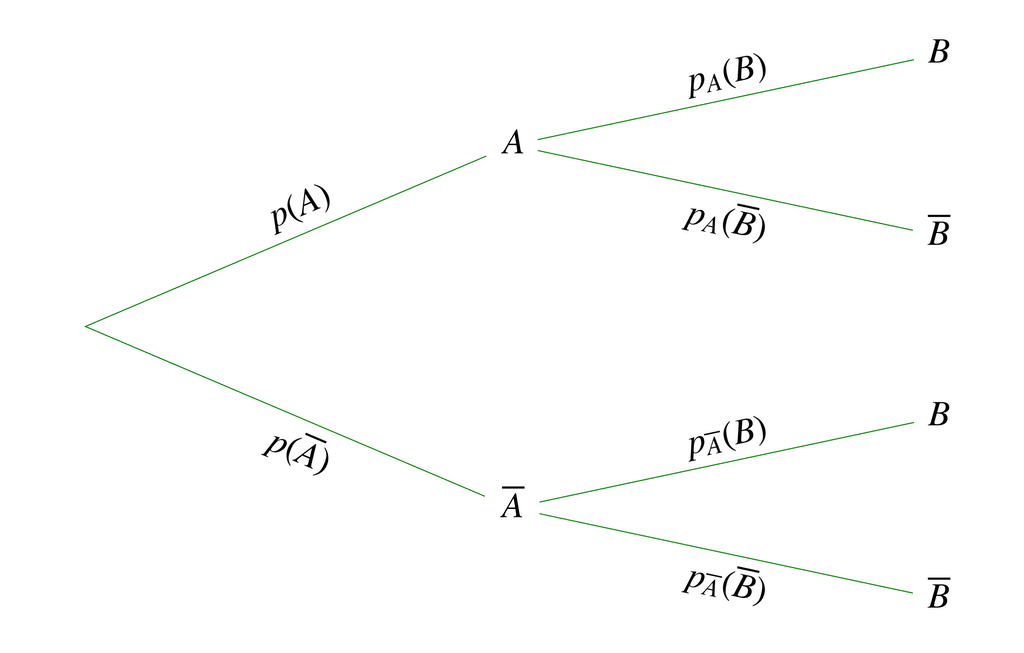 On considère deux évènements $A$ et $B$ et on note $\bar{A}$ et $\bar{B}$ les évènements contraires. Voici les deux arbres que l’on peut construire à partir de ces informations :