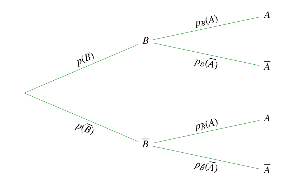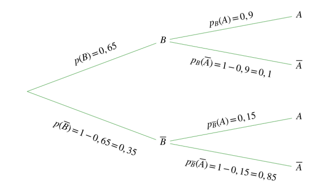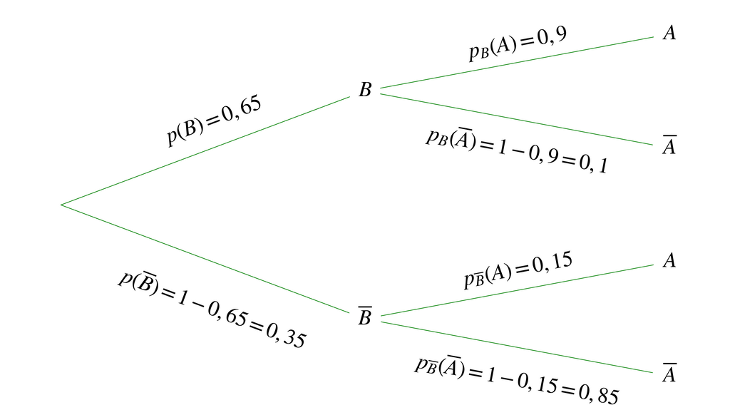 2. On oublie les informations de la question précédente et on en donne de nouvelles : $p_B(A)=0,9$, $p(B)=0,65$ et $p_\bar{B}(A)=0,15$.