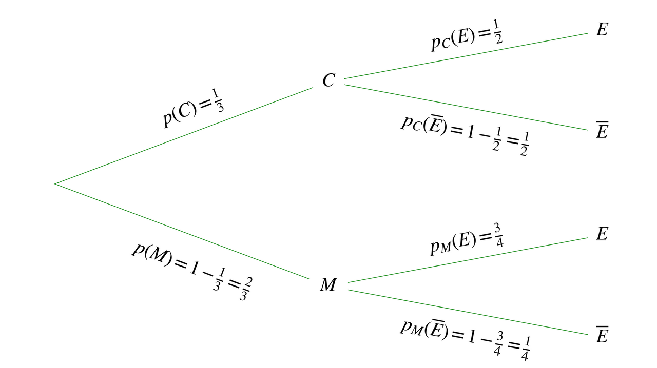 Attention, sur les branches issues d’un autre noeud, on écrit la probabilité de l’évènement sur lequel la branche arrive sachant que l’évènement depuis lequel la branche commence est réalisé. C’est donc une probabilité conditionnelle.