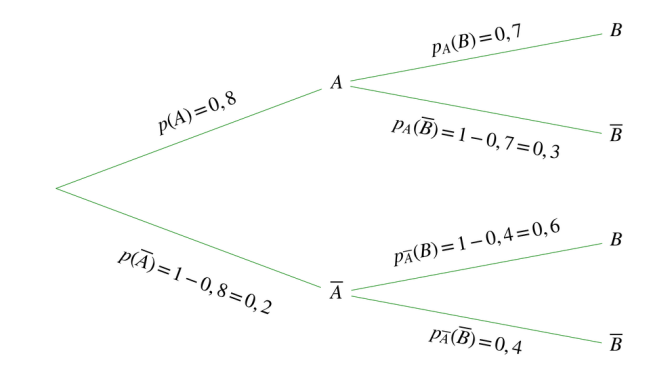 1. On donne les informations suivantes : $p(A)=0,8$, $p_A(B)=0,7$ et $p_\bar{A}(\bar{B})=0,4$.