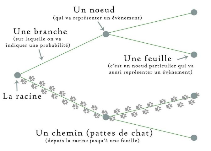 Dans le cadre des exercices de probabilités conditionnelles, on place des évènements sur les noeuds (donc aussi sur les feuilles) et des probabilités sur les branches.