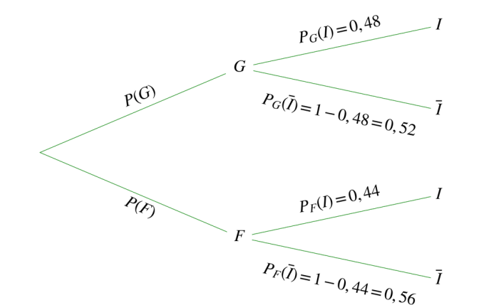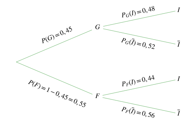 - Calculer $P(G)$, $P(F\cap I)$ et une valeur approchée au millième de $P_{\bar{I}}(F)$. On pourra utiliser un arbre.